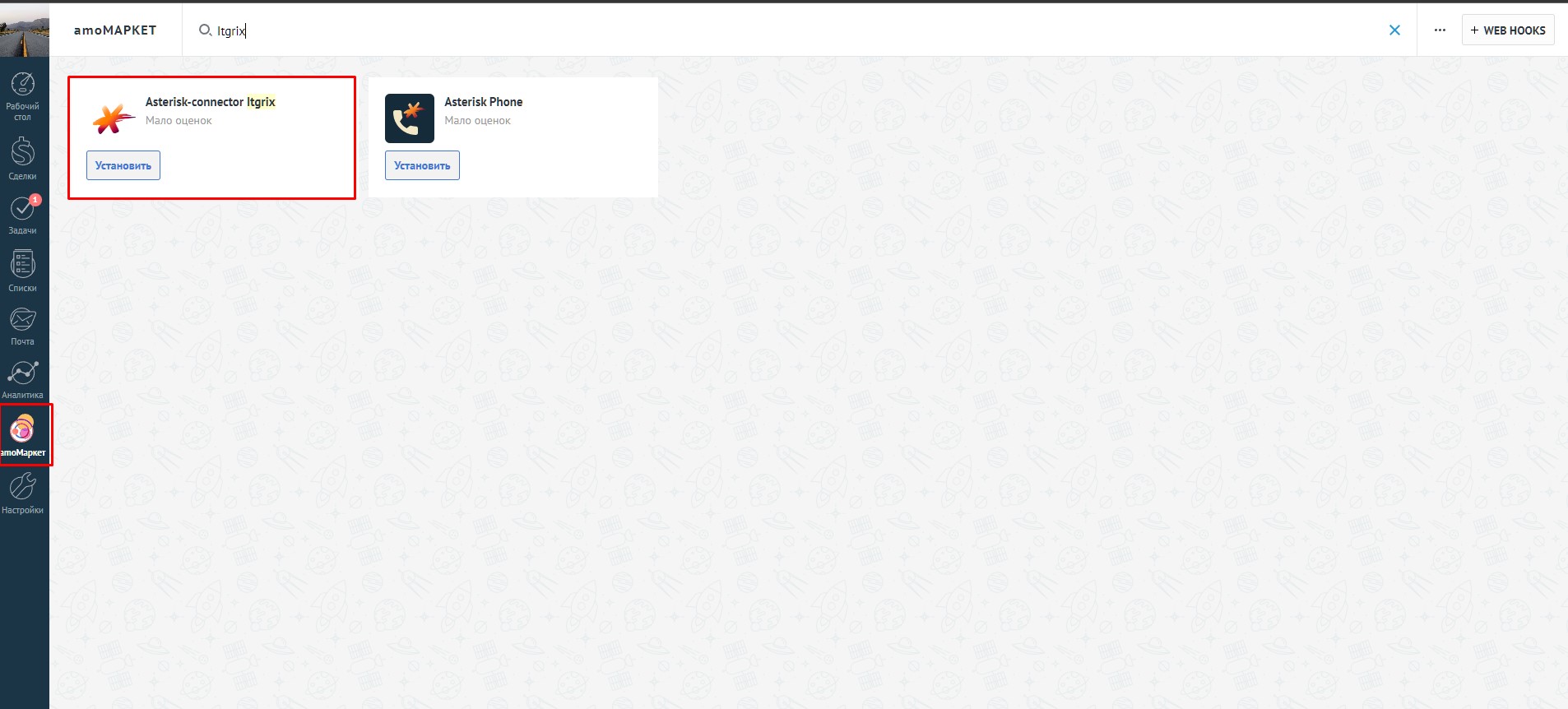В поисковой строке наберите **Itgrix**, либо Asterisk. Выберите приложение **"Asterisk connector Itgrix"**.
